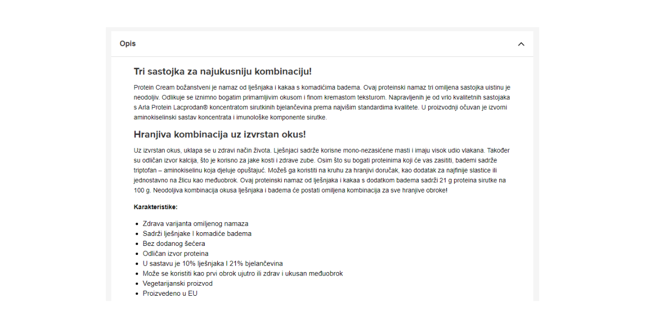 Dobro napisan opis proizvoda na web shopu jednako je važan kao i dobar web dizajn, privlačne fotografije i intuitivno korisničko iskustvo. Ako su vaši opisi proizvoda napisani privlačnim jezikom i dobro SEO optimizirani, prenijet ćete informaciju kupcu i povećat ćete šansu za prodaju vaših proizvoda na web shopu.